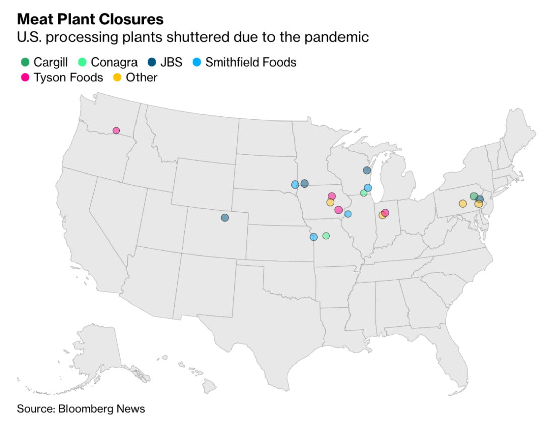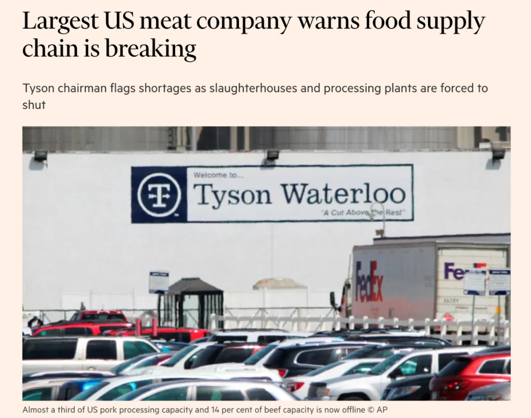 美国最大的肉类公司泰森食品(Tyson Foods)董事长约翰·泰森(John Tyson)表示:“在猪肉,牛肉和鸡肉工厂被迫关闭后,即使是在很短的时间内,数百万磅的肉也将从供应链中消失。”泰森食品(Tyson Foods)在上周关闭了三间屠宰场,并选择部分开放第四间屠宰场,以测试工人在疫情期间的工作情况。农业经济学家说,由于这种疾病蔓延到包装设备密集的切割车间,目前美国近1/3的猪肉加工能力和14%的牛肉产能处于离线状态。