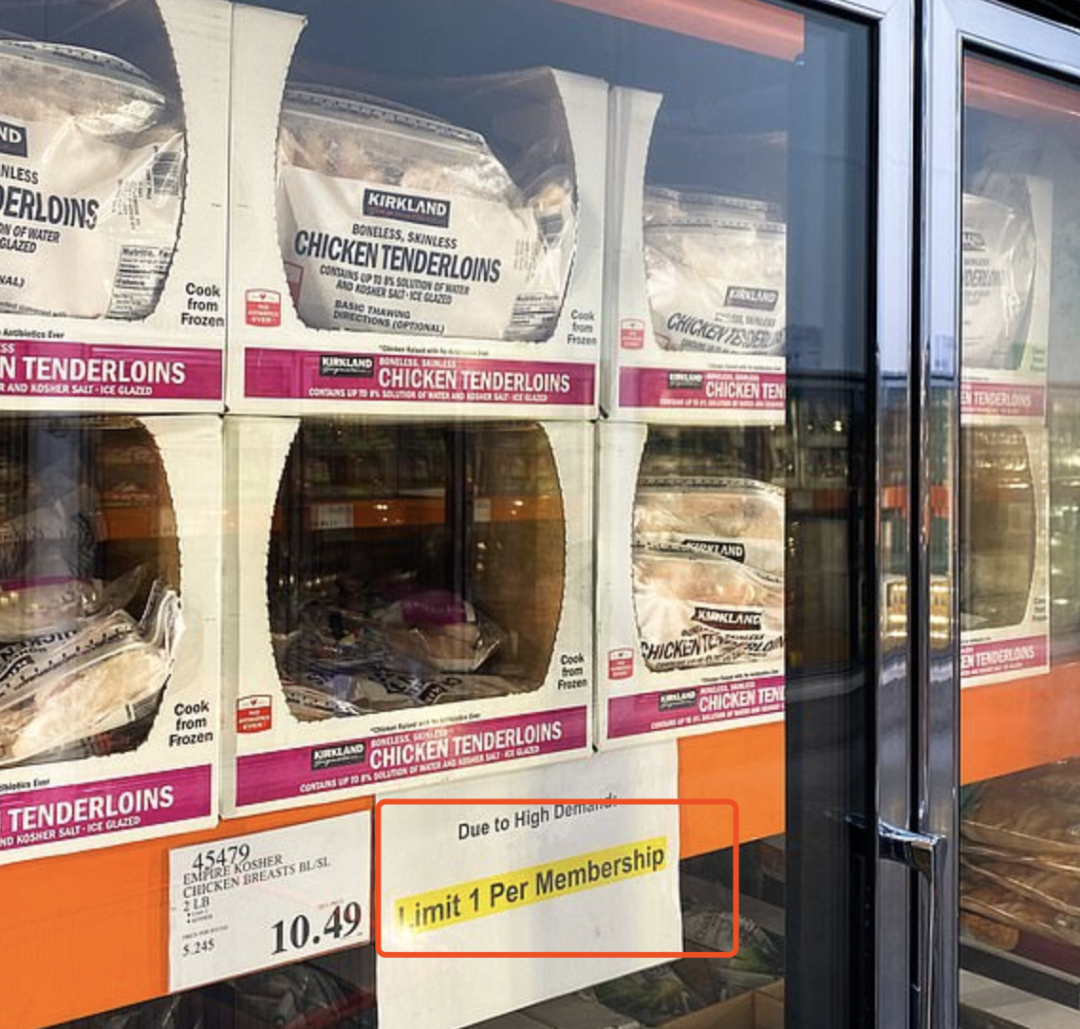 Costco决定开始对新鲜肉类产品实施购买限制。周一正式宣布,每名顾客顾客最多只能买三样鲜肉产品,可在牛肉、家禽和猪肉产品中挑选。和上个月的限购水和限购纸巾的目的一样,Costco 希望确保更多的居民能够买到他们想要的商品。