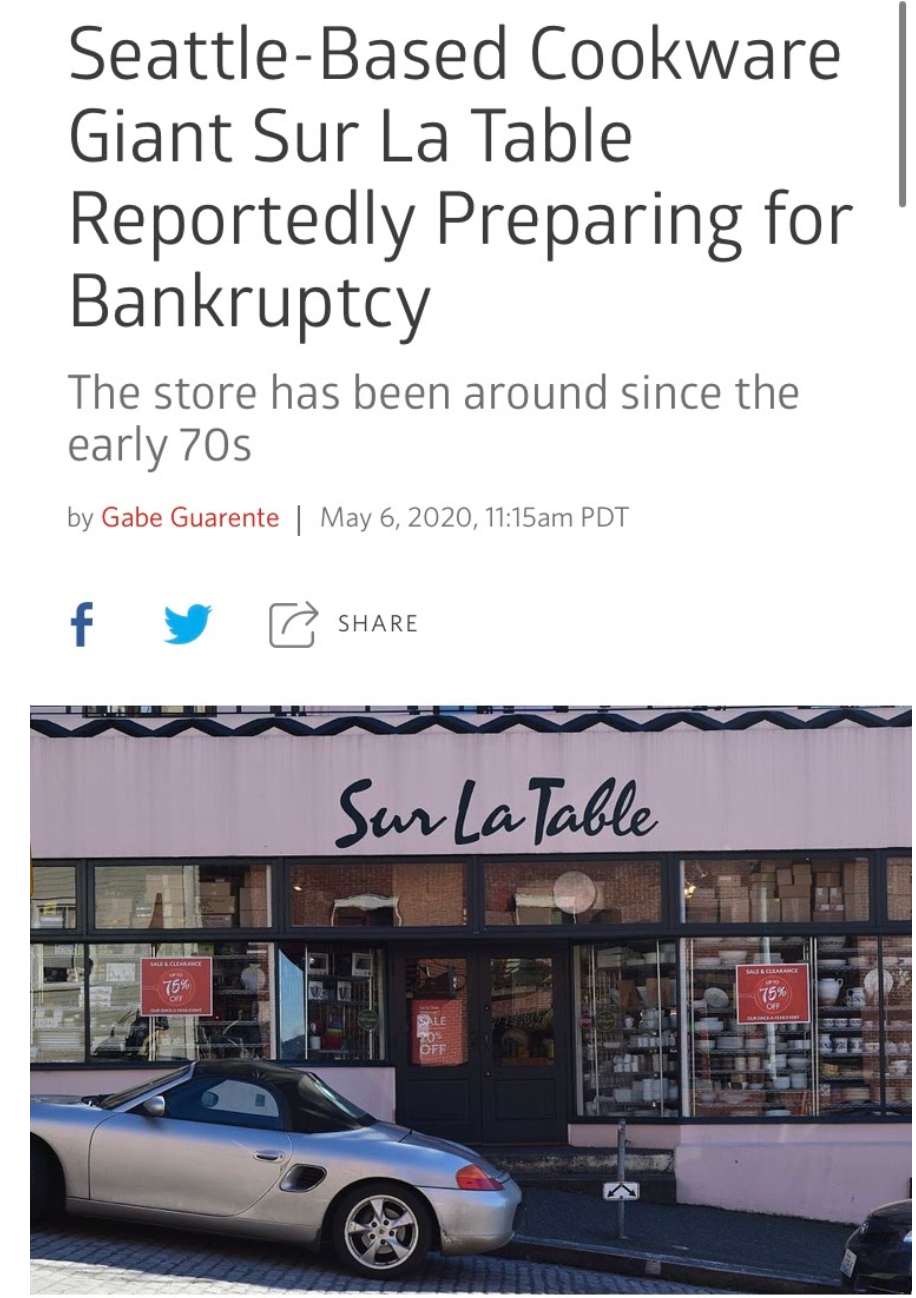 新冠肺炎疫情引发的经济低迷,除了对百货公司和零售行业产生了巨大冲击,还可能会让总部位于西雅图的大型炊具公司Sur La Table不复存在。