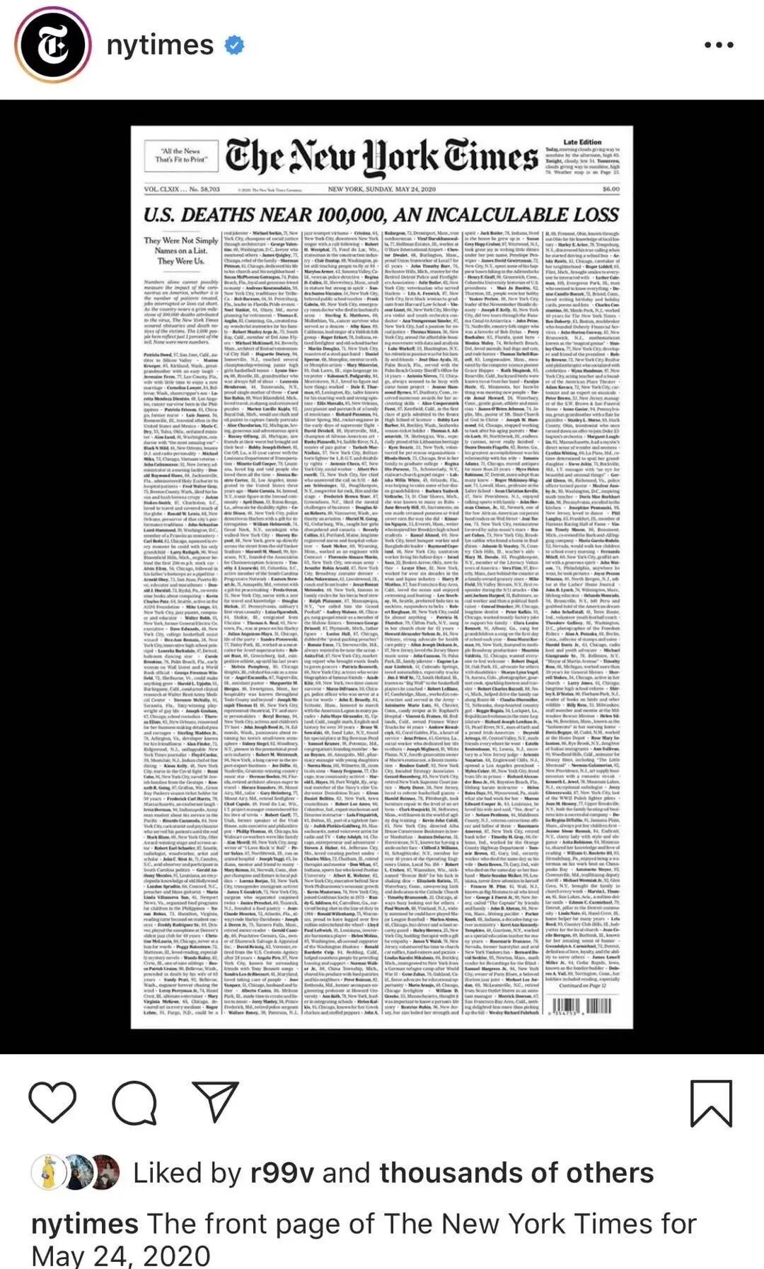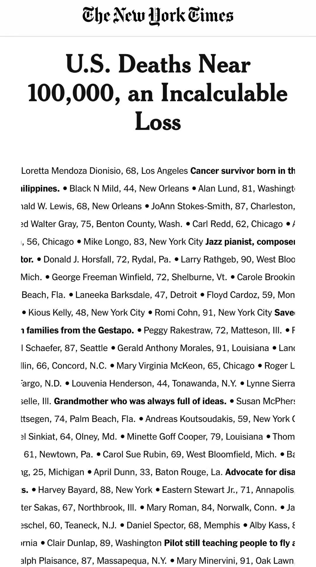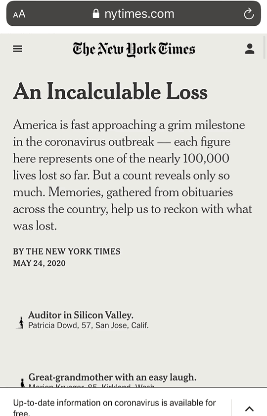 今天的纽约时报,标题是:美国死亡接近10万,无法计算的损失。然后,是密密麻麻的1000个死者信息,导语是:他们不仅仅是一个个名字,他们曾经是我们……