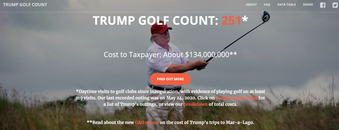 据特朗普高尔夫统计网站(Trump Golf Count),从2017年1月上台至今年5月23日,特朗普总共打了251次高尔夫,总共花费纳税人1亿3400万美元。