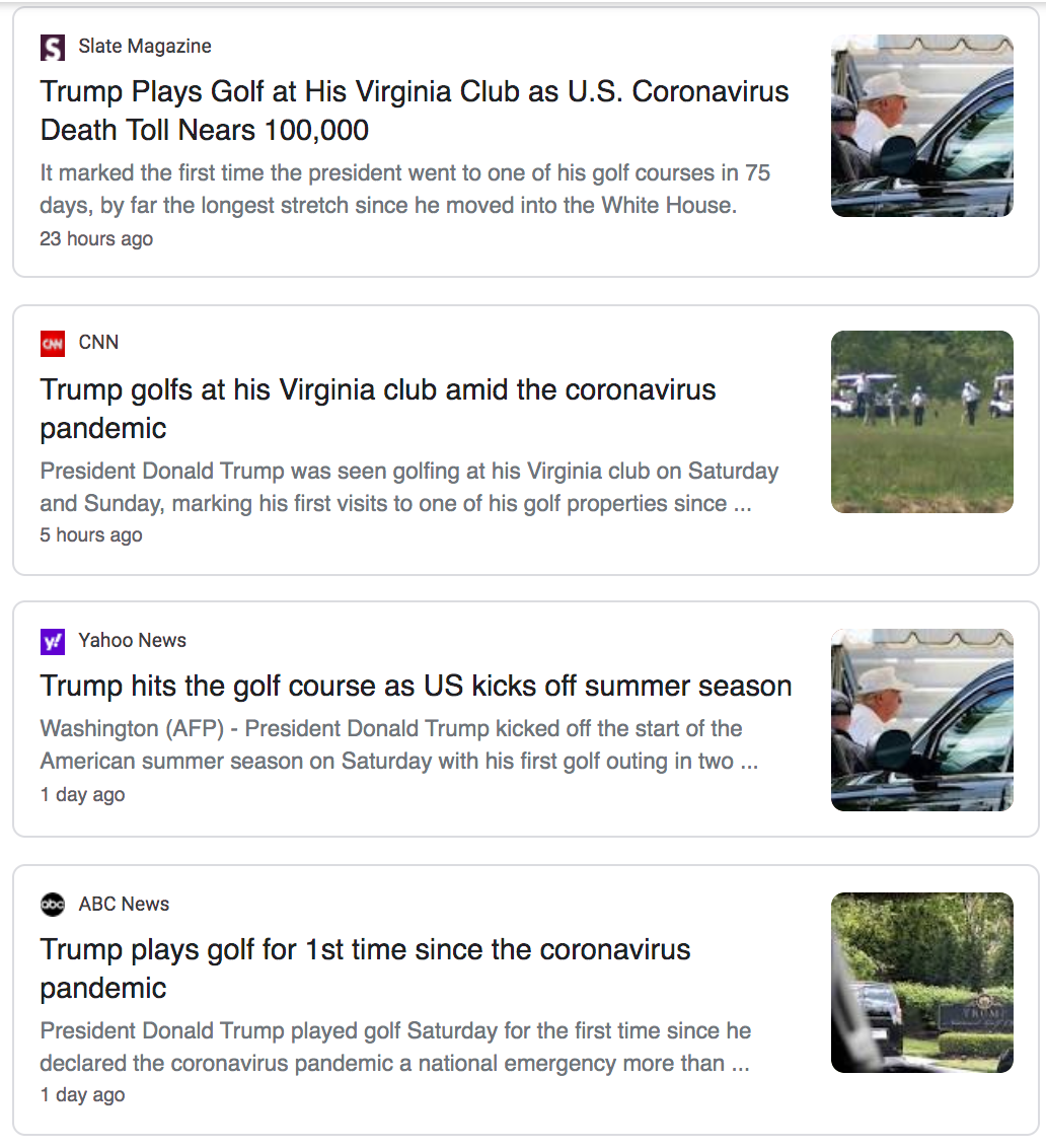 纽约时报的电子头版图片在5月23日发布,同一天,美国总统川普则在他自己的私人高尔夫球场办了一件大事: