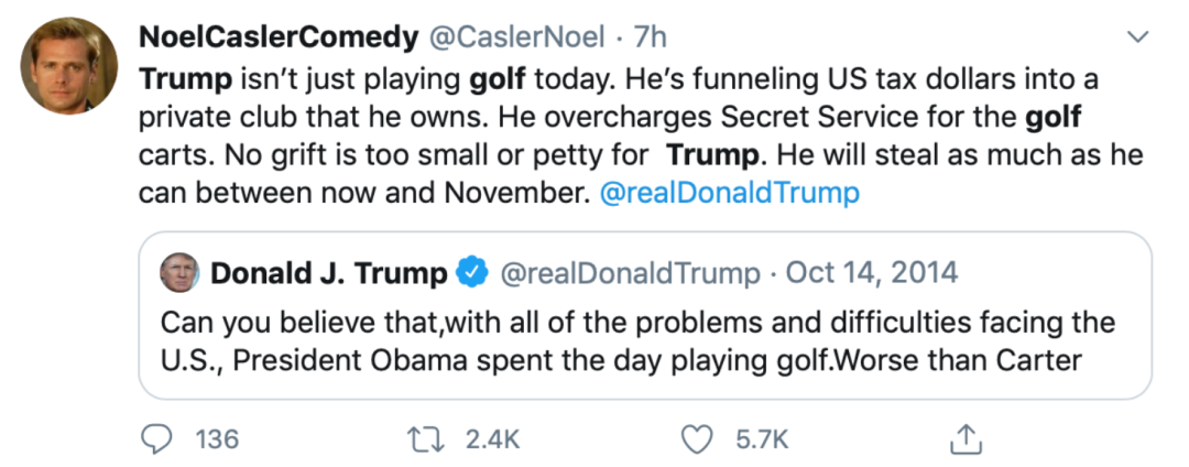 还有网友翻出了特朗普2014年10月14日发的一条推特,当时他指责时任总统奥巴马在美国遭遇各种问题和困境时,却去打高尔夫了,称奥巴马“比卡特还糟糕”。有网友指出,特朗普还不仅仅是打高尔夫,他更是“将纳税人的钱花在了他所有的一家私人俱乐部”,指责他因私人爱好花费纳税人的钱。