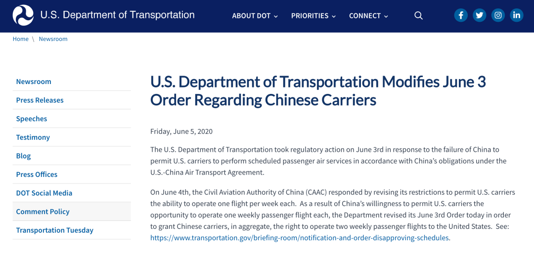 这是官网上的原文和新版的命令:美国交通部表示,因为中国民航局修改了对美政策,允许美国每个航空公司每周有一班航班往返中美,美国也立刻做出回应,修改了对应政策,而且通知将即刻生效。