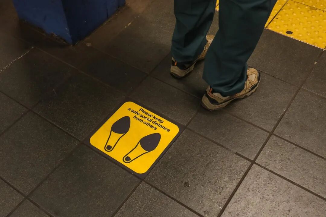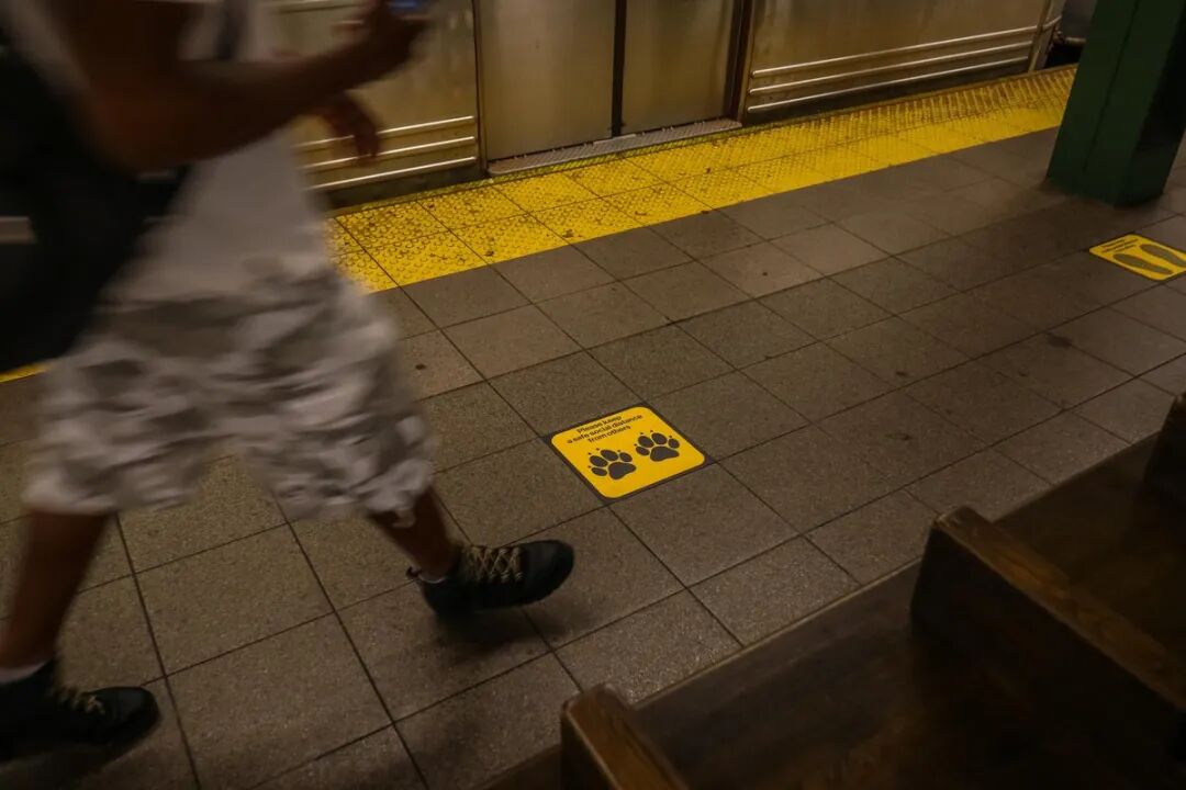 地铁站内地面上贴印呈脚印形状的黄色地板贴花,其他相关标牌也是黄色的,提醒乘客戴上口罩并采取其他预防措施。黄色的贴花不只有人类脚印,还有动物爪印🐾和马蹄印。