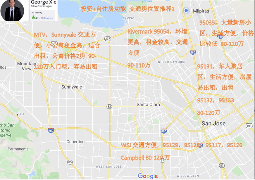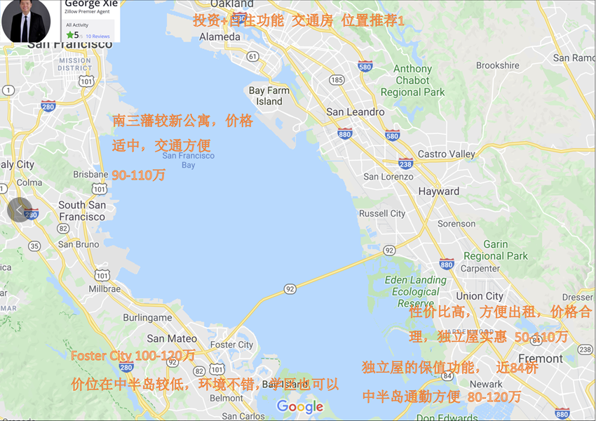 CIPS 美国地产协会国际地产注册师 George Xie 分享了一份湾区投资+自住功能交通房对比地图。
