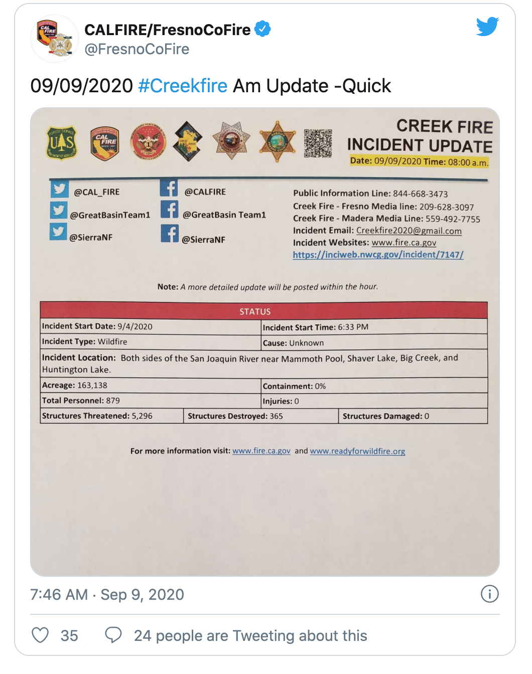 北加州的普拉马斯国家森林(Plumas National Forest)中的北方综合大火正向附近的奥罗维尔市(Oroville)发出了疏散警告,影响约20,000人。